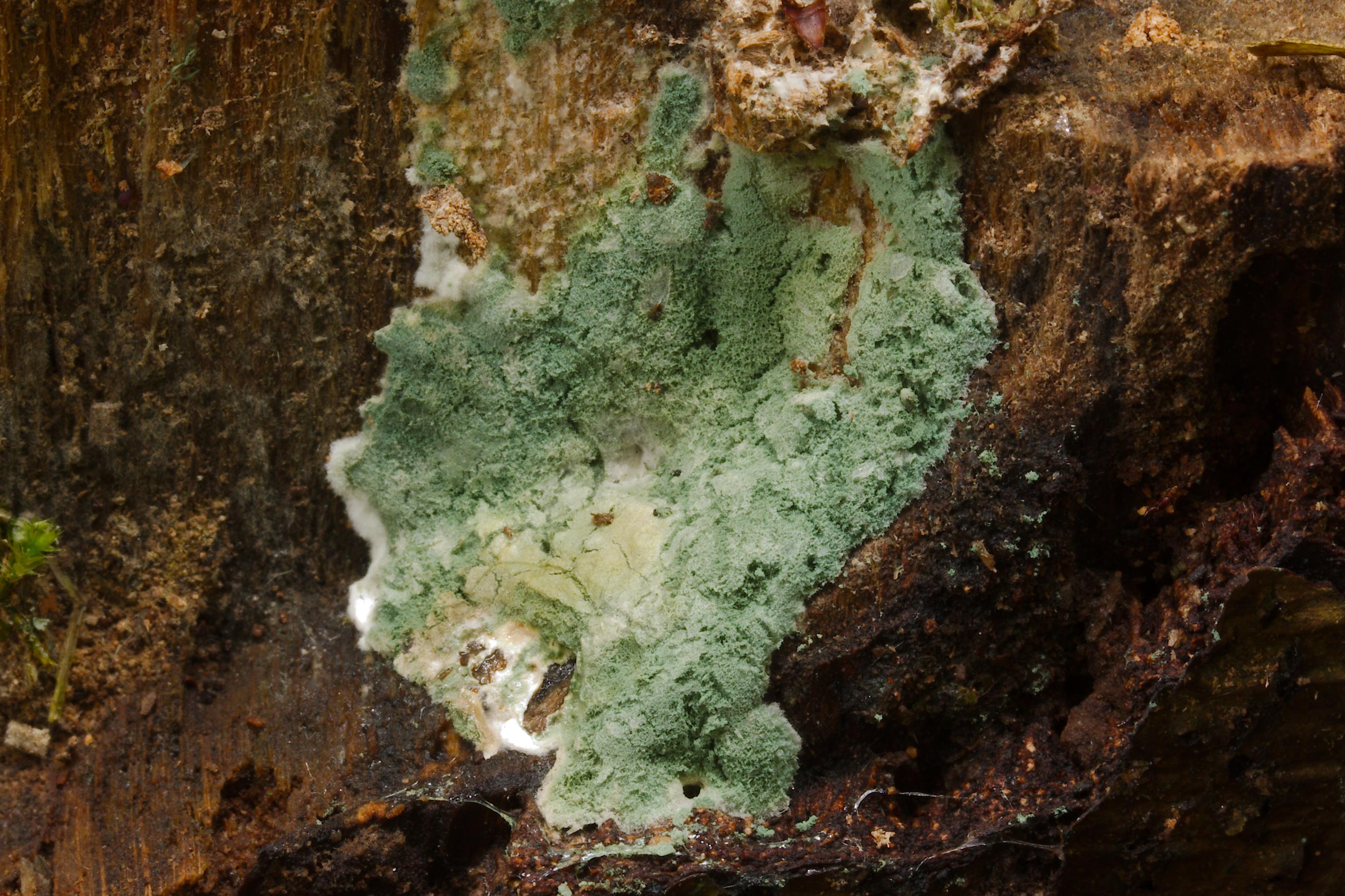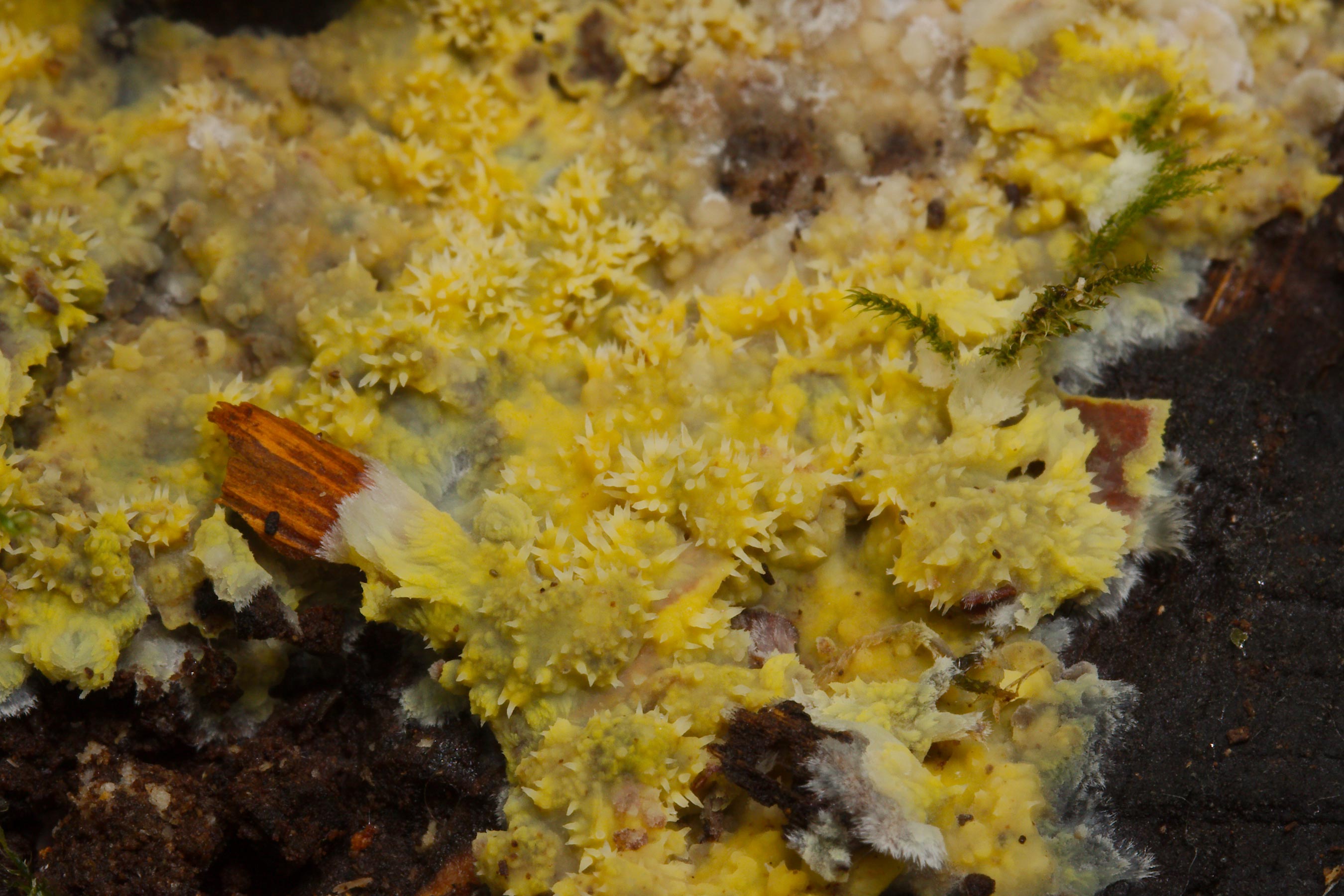 Natuurlijk ontbraken hout- en korstzwammen niet tijdens de excursie. De fraaiste was zondermeer de gele stekelkorstzwam (Mycoacia uda) (foto 5). Met de loep is te zien, dat het heldergele vruchtlichaam is opgebouwd uit tere stekels. Een andere kleurrijke schimmel was het groen viltmatje. Het groen viltmatje staat in geen enkel boek vermeld, omdat dit viltmatje het imperfect (ongeslachtelijk) stadium is van het van rossige kussentjeszwam (Hhypocrea rufa). Via internet was de Nederlandse naam van de soort gelukkig wel te vinden (foto 6).