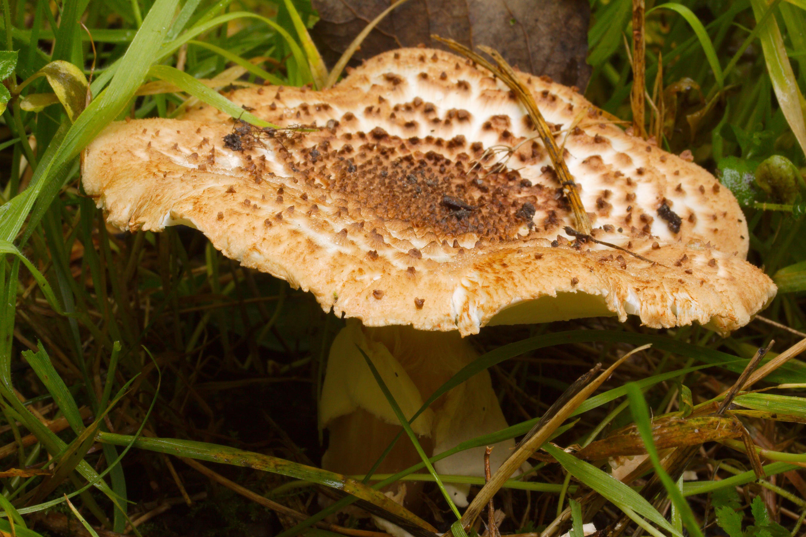 De excursie eindigde langs de enigszins verruigd ogende populierenlaan, met brandnetels en strooiselhopen. Hier werden twee soorten die voor het merendeel van de deelnemers onbekend waren. En het was een geluk, dat beide soorten niet ver van elkaar stonden. Zowel de spitsschubbige parasolzwam (Lepiota aspera) (foto 7) als de vleeskleurige zalmplaat (Clitopilus geminus) (foto 8) houden van voedselrijke plekken.