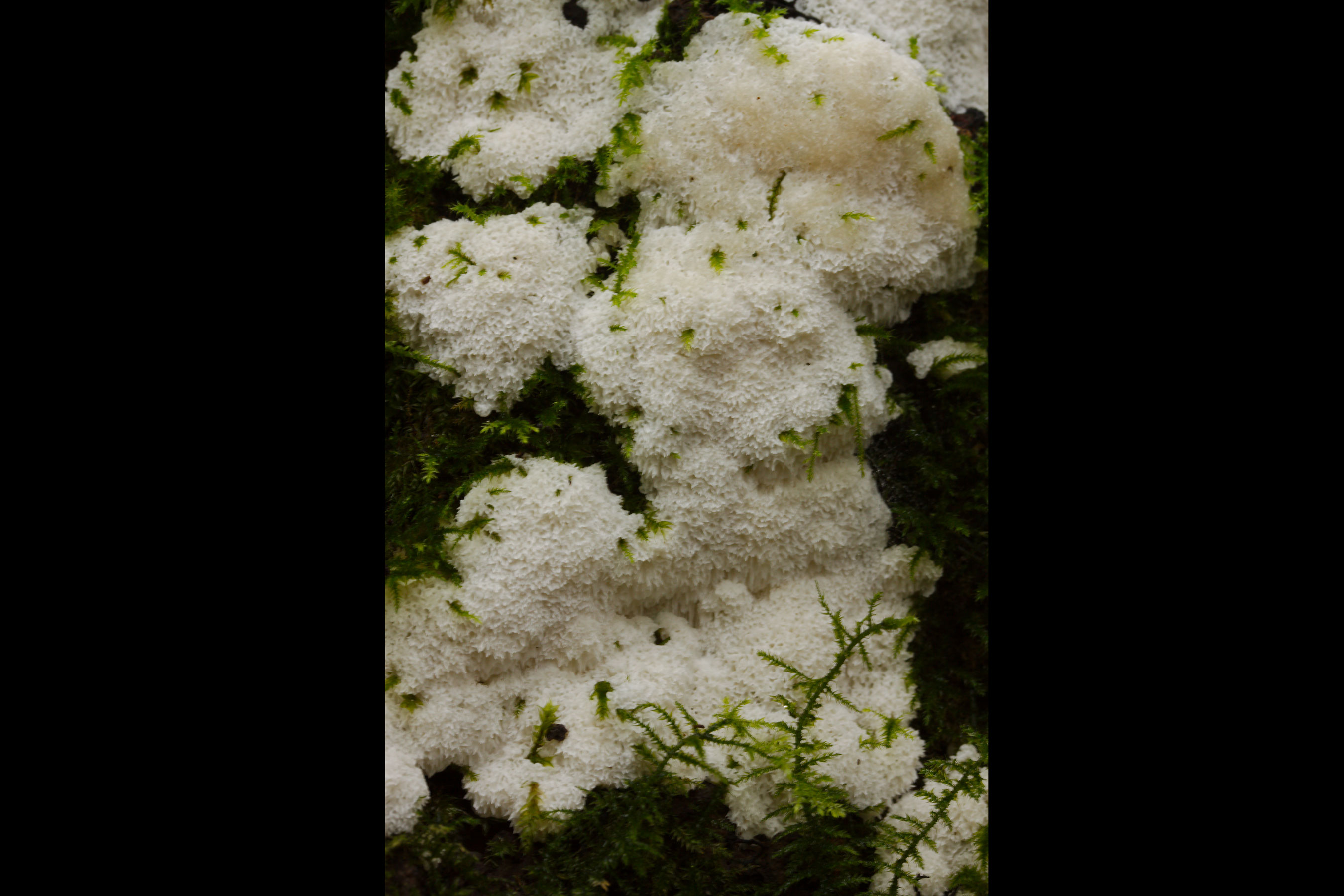 Een paar meter verderop zagen we een groot aantal stronken die met een witte massa waren overdekt. Van dichtbij, en nog duidelijker met een loep, zien deze korsten er als een soort honingraat uit. De witte tot grijze kleur geven deze raten een glasachtig uiterlijk. Ook de glazige buisjeszwam (Physisporinus vitreus) is in Friesland een vrij zeldzame paddenstoel (foto 2). Deze zwam heeft in het Flietsterbosk een vaste woonplaats gevonden, want ook in 2015 stond deze soort op de lijst.