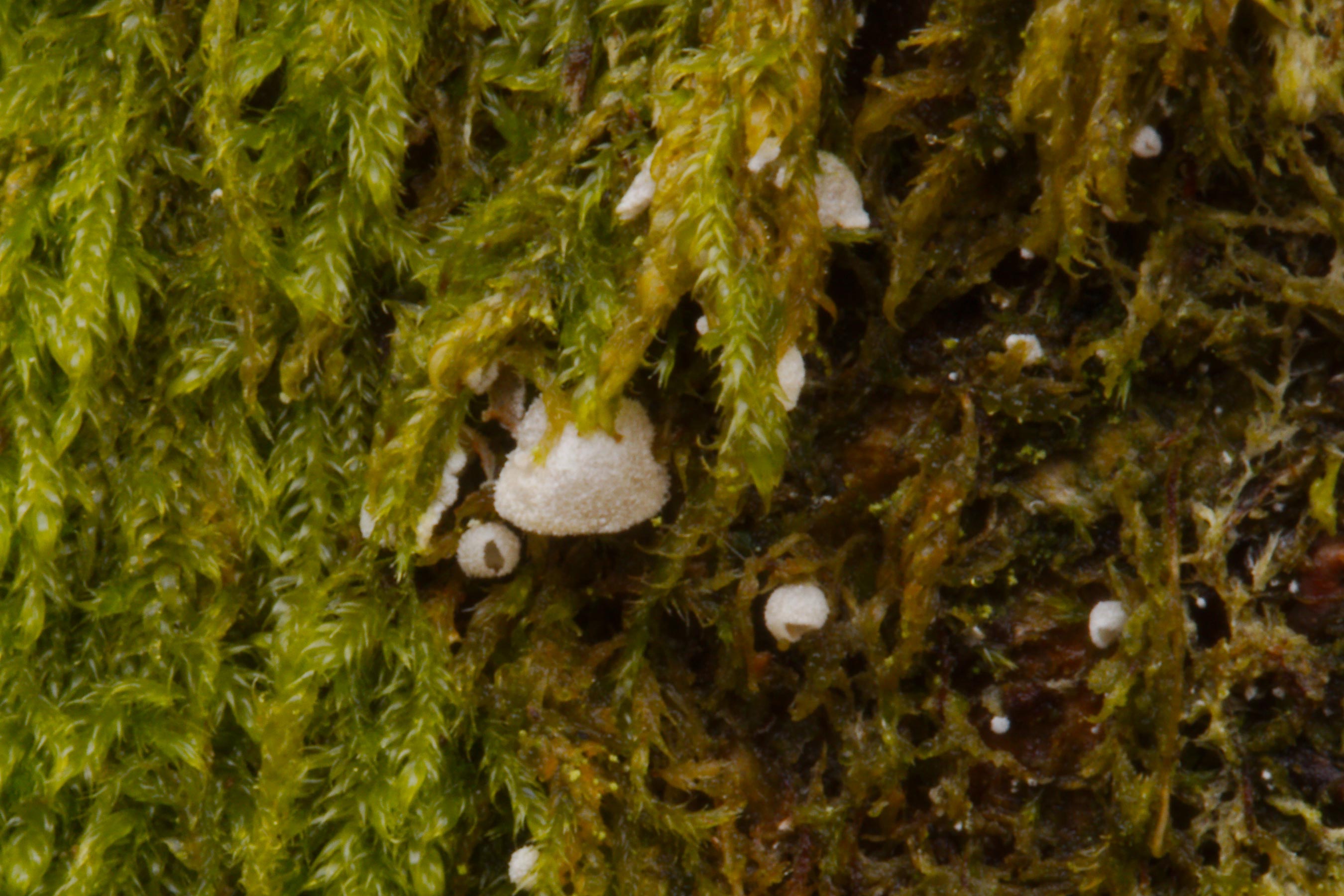 Het mosschelpje (Chromocyphella muscicola) verraadt zijn aanwezigheid door kringen in mos dat op stammen groeit, vaak van beuk, maar ook van andere bomen. De kring bestaat uit afgestorven mos. Wie dan met een loep kijkt, ziet tussen het mos de witte schelpjes in dichte groepen. Sinds in 2012 in Friesland bekend werd, dat deze kringen door een paddenstoel worden veroorzaakt, wordt de soort jaarlijks tientallen keren gemeld en behoort het tot de algemene soorten (foto 5).