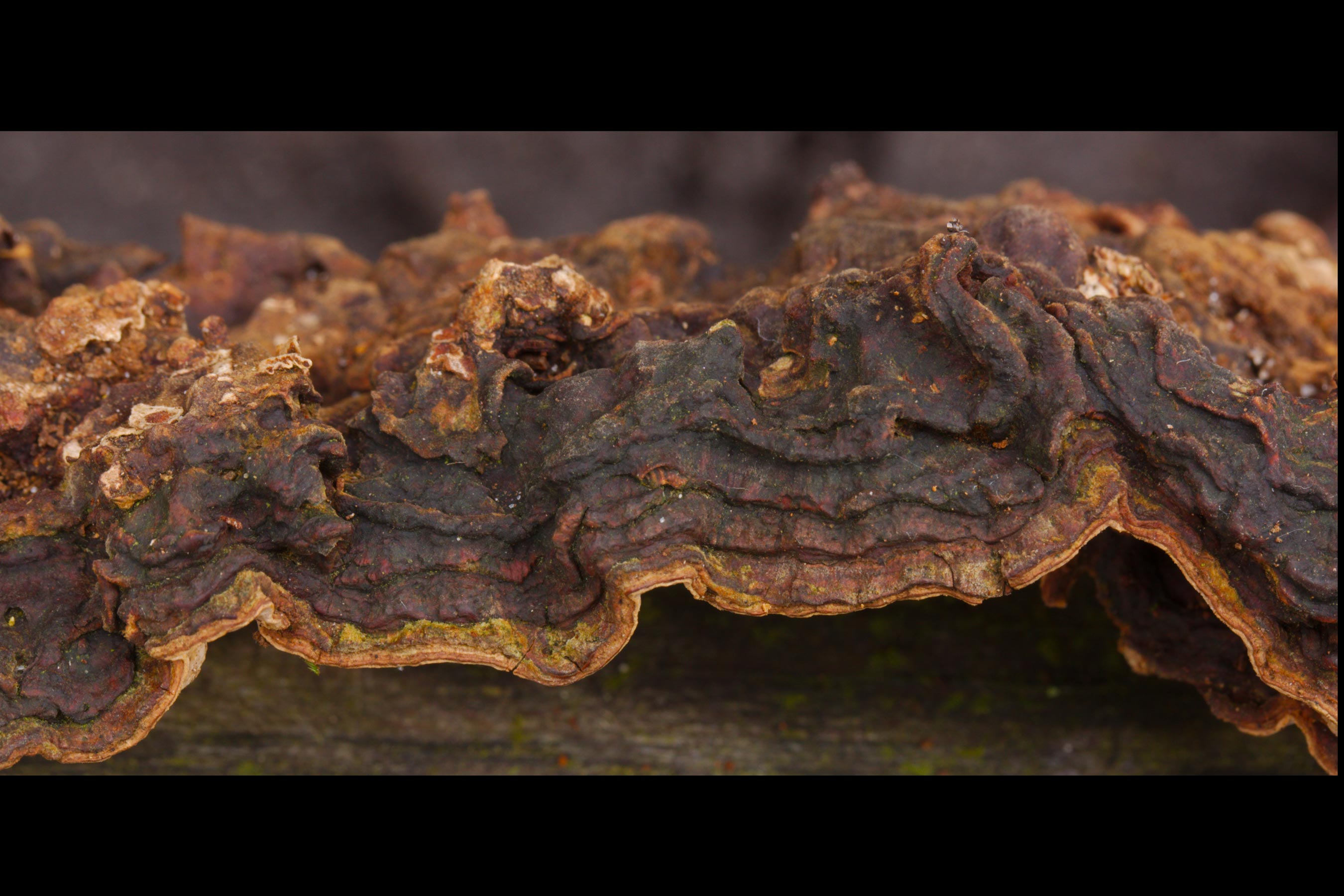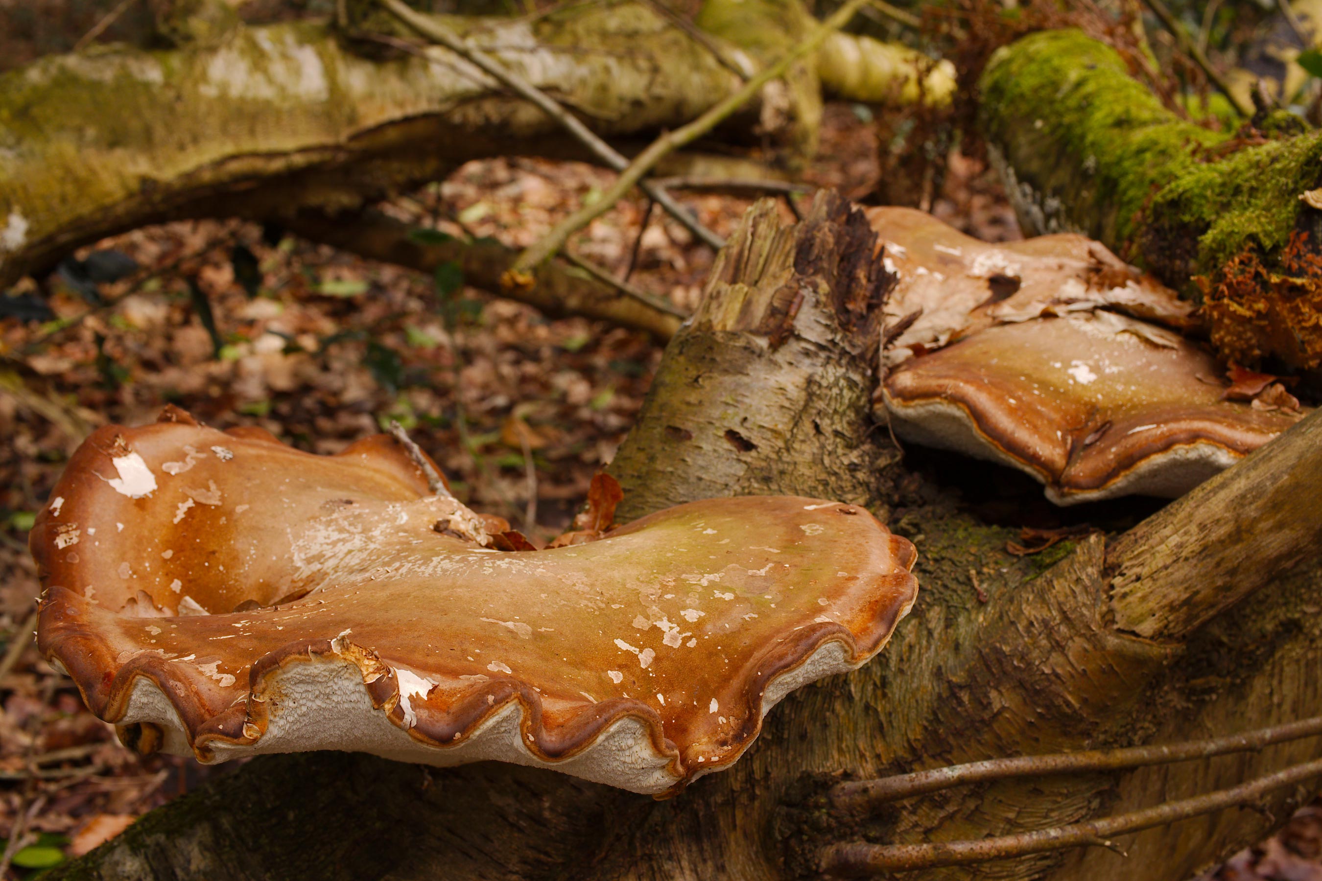 Niet ver van de oesterzwam lagen enkele omgevallen berken. Op één daarvan groeiden spectaculair grote berkenzwammen (Piptoporus betulinus) (foto 7). Daarnaast werd ook nog een oud exemplaar van de roestkleurige borstelzwam (Hymenochaete rubiginosa) gevonden (foto 8).