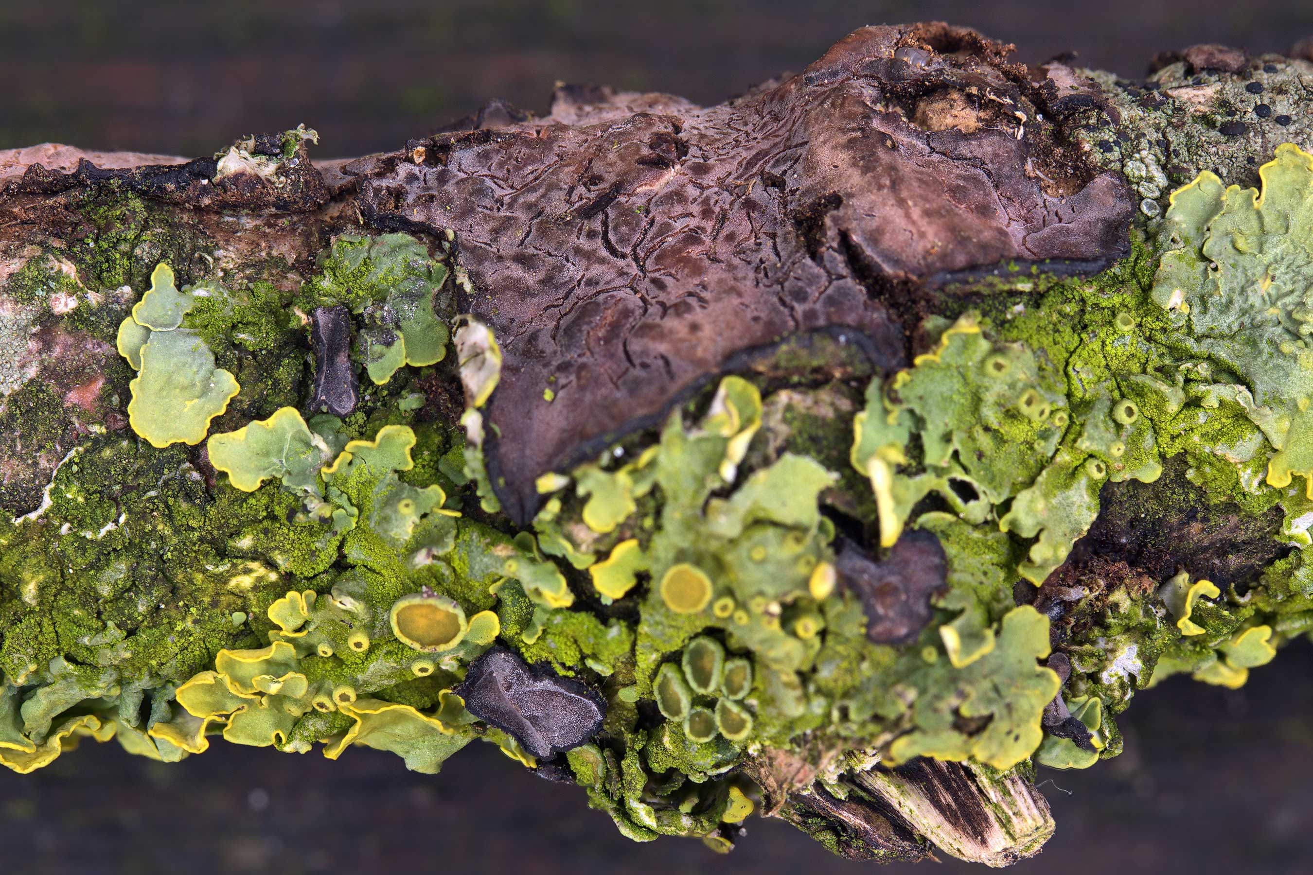 Enkele afgevallen takken waren bedekt met paarse eikenschorszwam (Peniophora quercina) in combinatie met het korstmos groot dooiermos (Xantharia parietina) (foto 1). De volgende aan eiken gebonden soort vonden we in het bos.