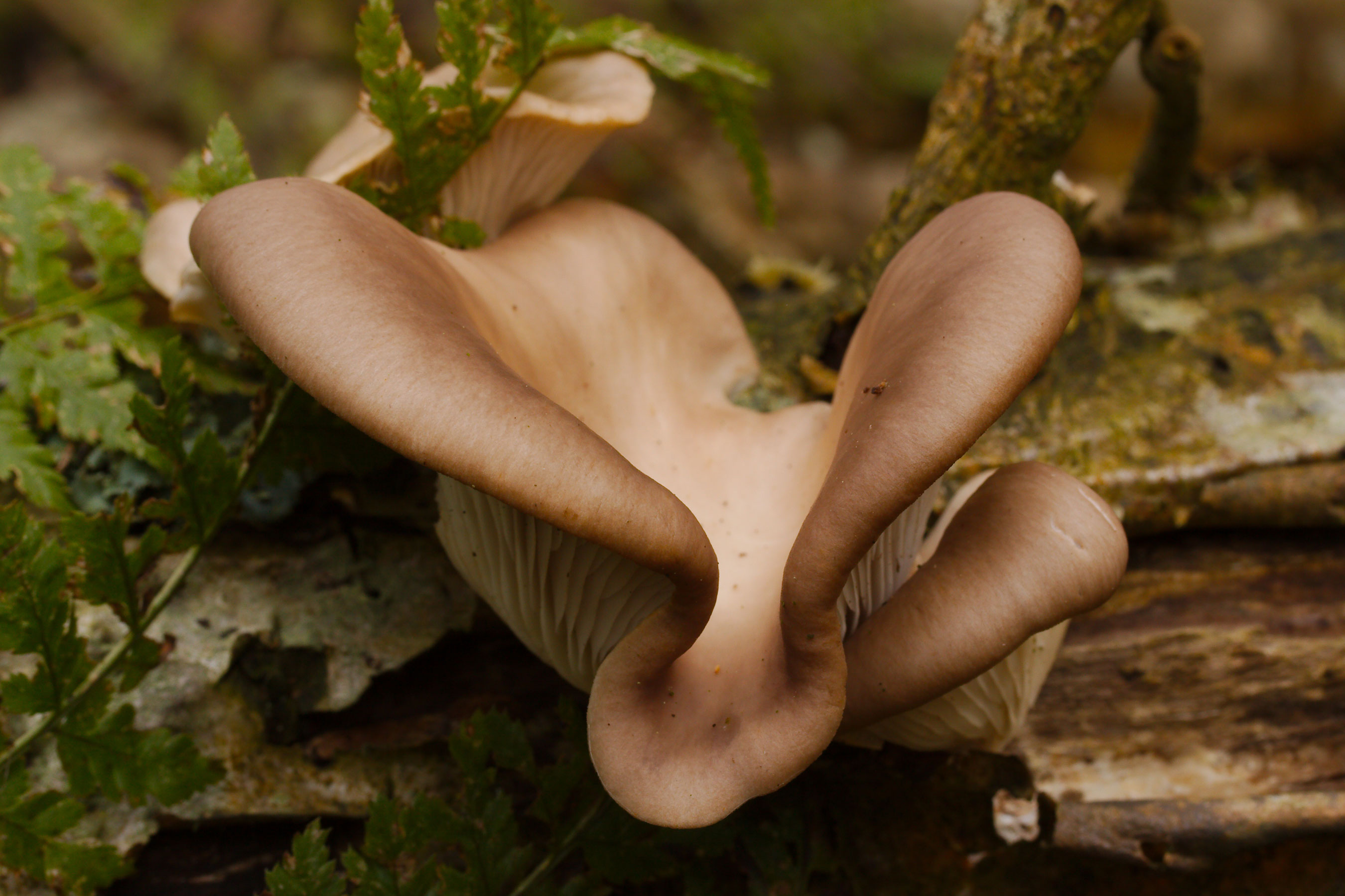 Na anderhalf uur door Grikelân en Turkije rondgezworven te hebben drong bij de deelnemers het besef door, dat de plaatjeszwammen schitterden door afwezigheid. Geen donsvoetjes (Tubaria furfuracea), geen zwavelkopjes (Hypholoma fasciculare), geen fluweelpootjes (Flammulina velutipes). Het enthousiasme was dan ook groot, toen op een omgevallen boom tussen de bramen enkele vruchtlichamen van de gewone oesterzwam (Pleurotus ostreatus) ontdekt werden. Normaliter wordt een oesterzwam alleen maar geregistreerd, maar nu moest de enige plaatjeszwam van de excursie toch even op de foto (foto 6).
