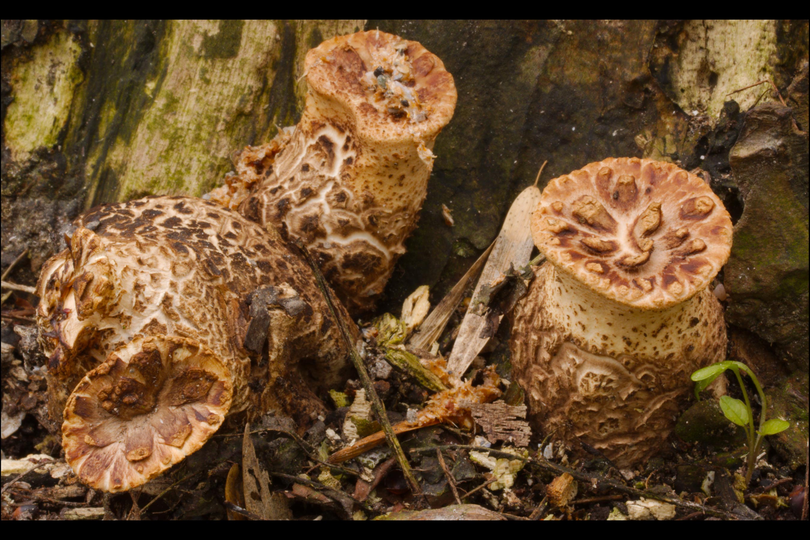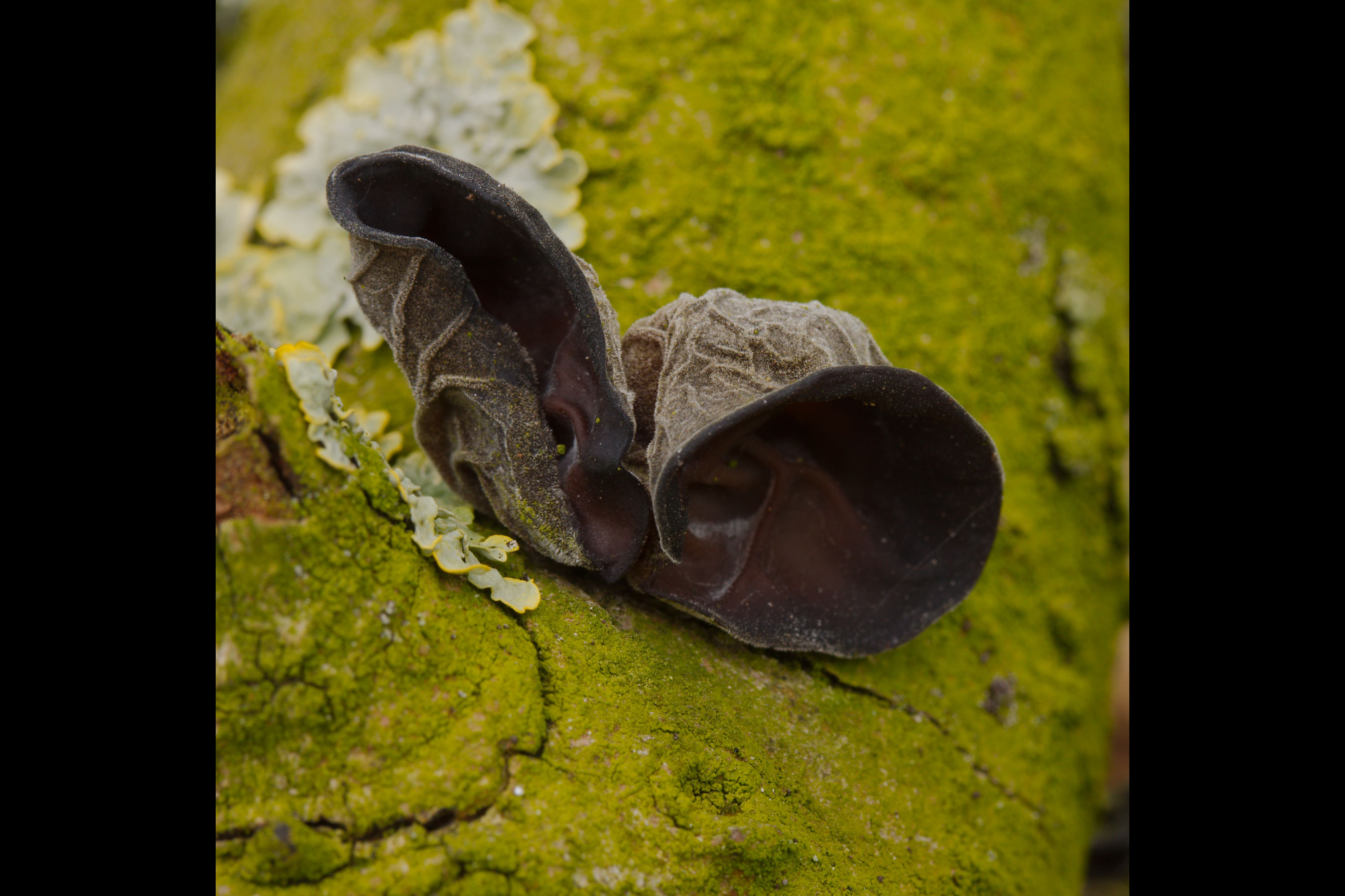 Ook het echt judasoor (Auricularia auricula-judae) bleek niet bestand tegen de droogte te zijn. Op verschillende plekken werden uitgedroogde vruchtlichamen gevonden. Wel maakt het contrast van de witte fluweelachtige buitenzijde en de donkere binnenzijde het verval fotogeniek (foto 2).