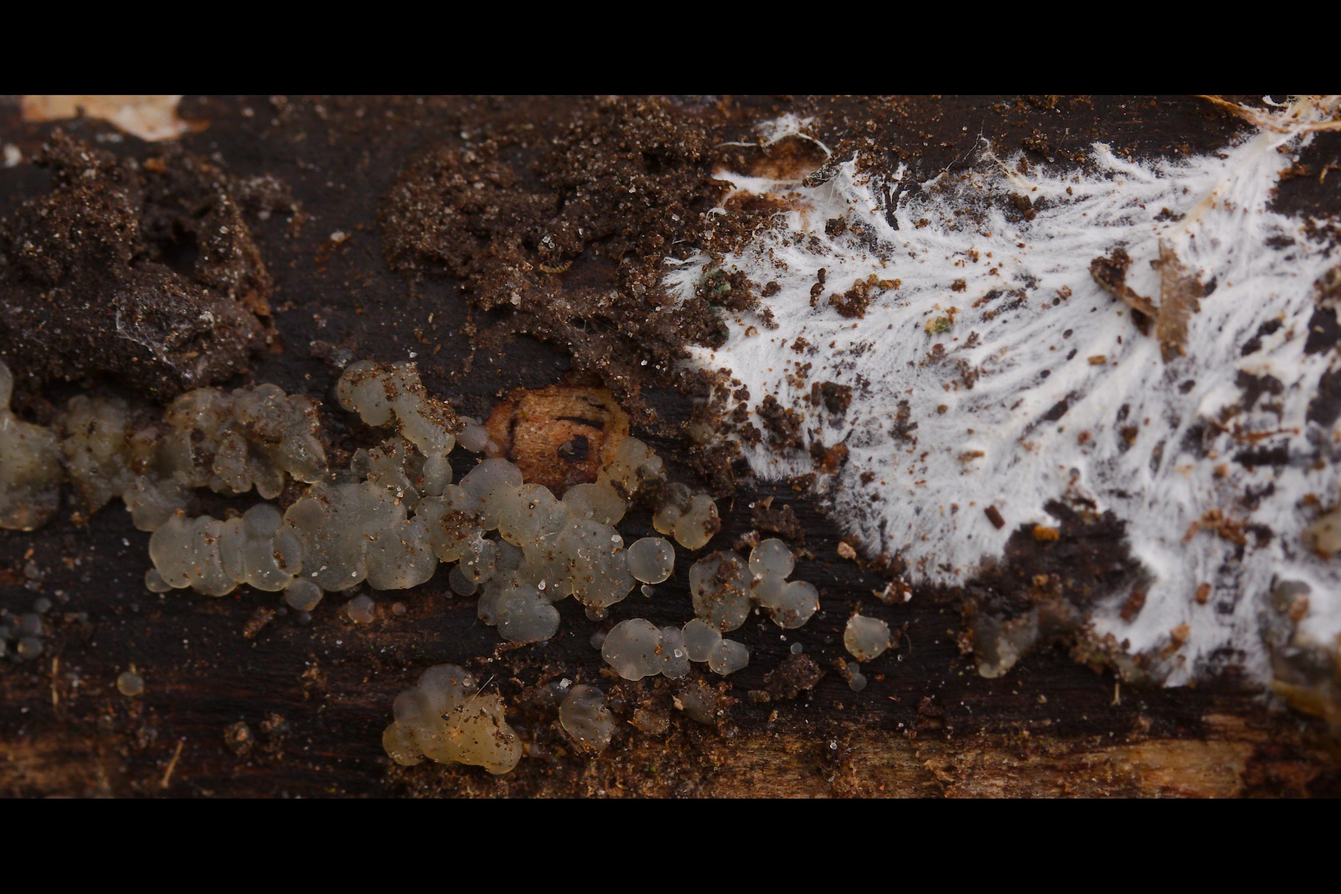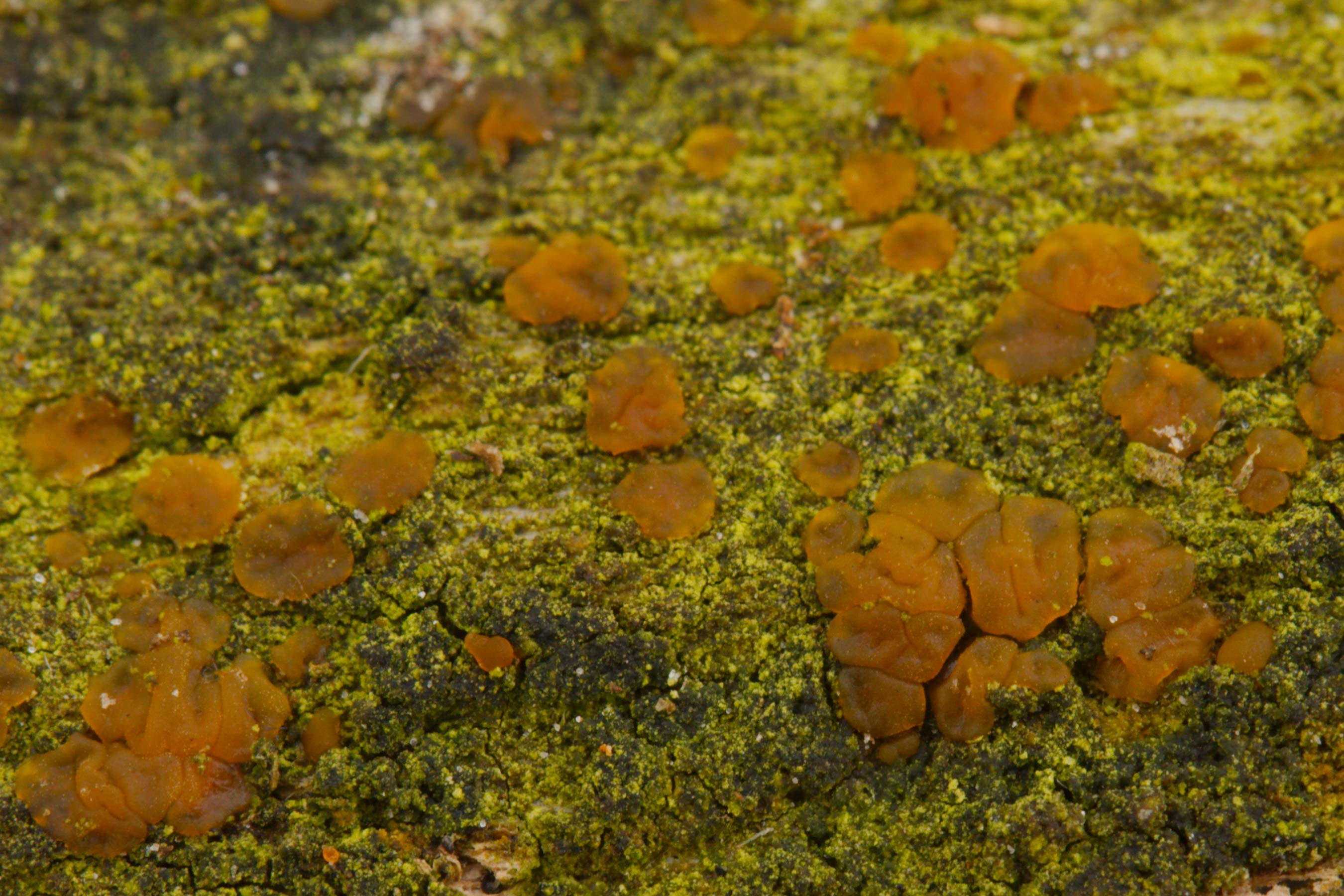 Waar trilzwammen minder aan de open lucht zijn blootgesteld, zien ze er meestal verser uit. De klontjestrilzwam (Exidia nucleata) die hier en daar in het Donia Bosk werd gezien, was altijd goed herkenbaar (foto 3). Ook de oranje druppelzwam (Dacrymyces stillatus) was op een op de grond liggende en verborgen tak goed tegen uitdroging beschermd (foto 4).
