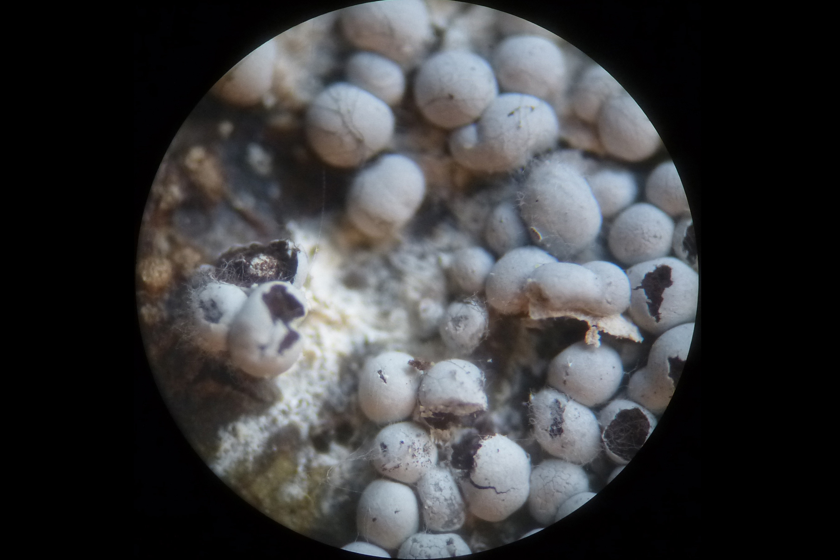 Toch, ondanks het geringe aantal soorten had ook deze excursie een hoogtepunt, en wel in de eerste Friese vondst van het bol kalkschaaltje (Diderma globosum). Deze slijmzwam is tot nu toe voornamelijk in zuidelijk Nederland gevonden (foto 7).